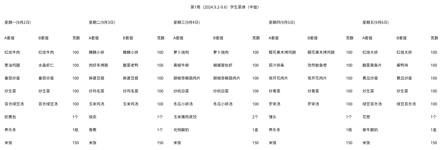 第1周(2024.9.2-9.6)学生菜谱(中餐)
