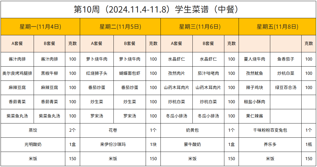 第10周(2024.11.4-11.8)学生菜谱(中餐)