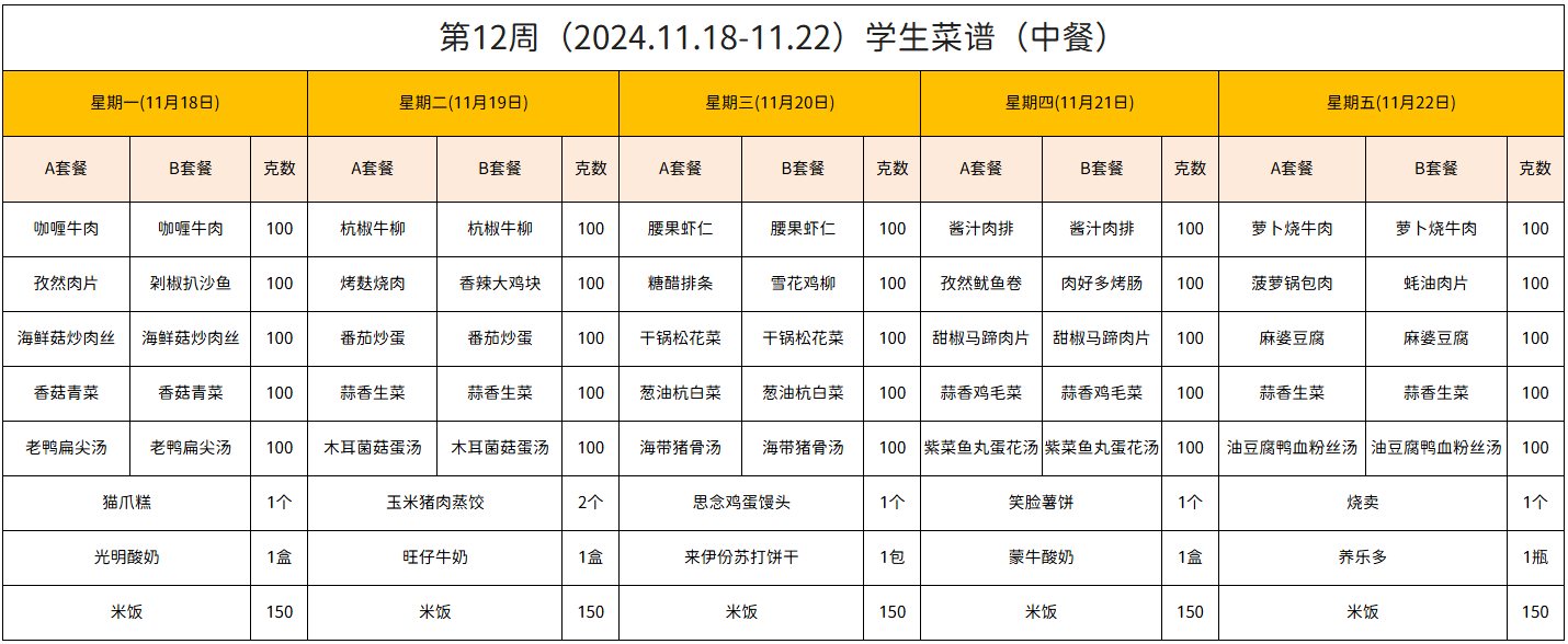 第12周(2024.11.18-11.22)学生菜谱(中餐)